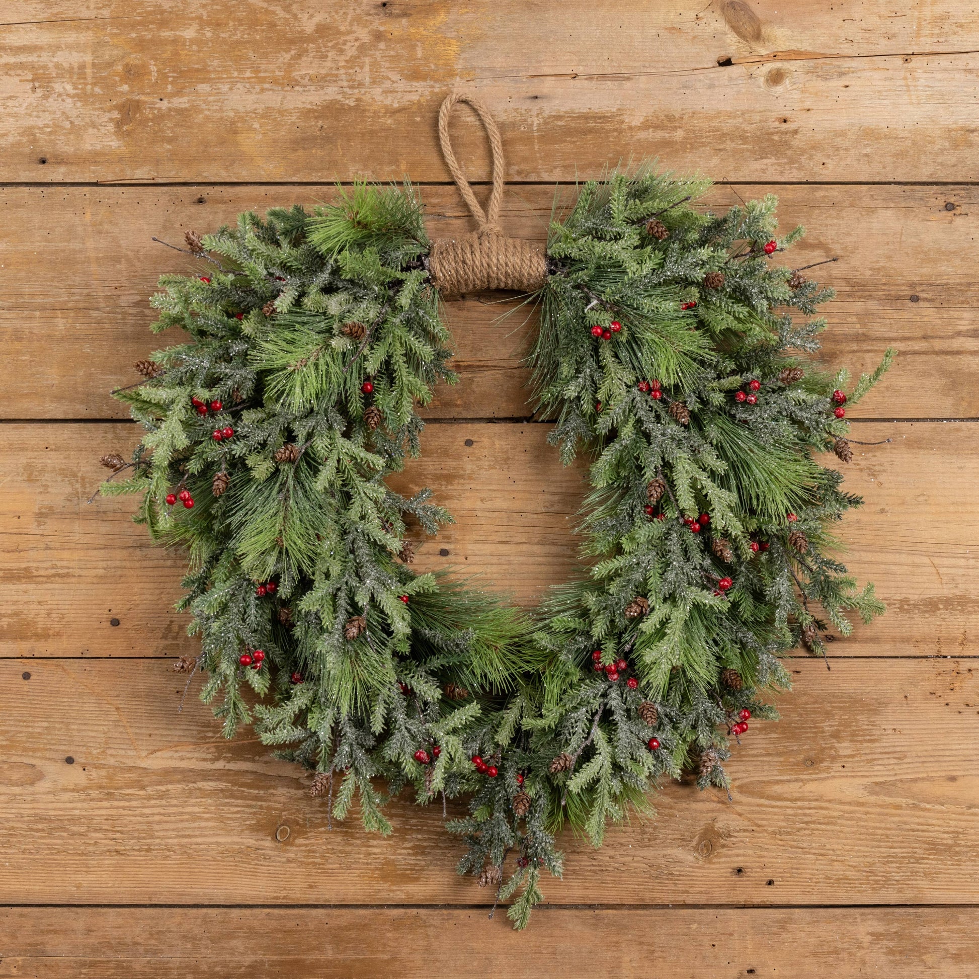 30" GLITTERED PINE & RED BERRY HANGING WREATH