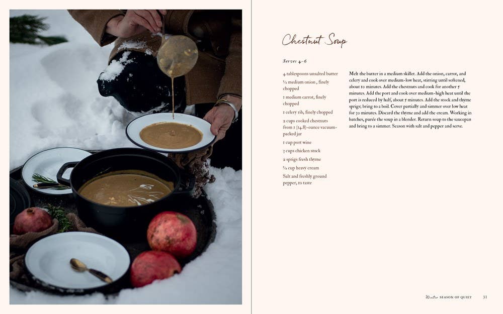 Alpenglow is filled with creative parties and fun country activities throughout the four seasons. The stories and scenes are set in the high mountain valley of Jackson Hole, Wyoming—but the gatherings and parties could take place anywhere. Hillary Munro knows how to turn routine activities and yearly rituals into unique events, with delicious meals and take-home favors prepared with foods she grows and preserves and materials she forages in the woods. Celebratory menus follow special times, like a cowgirl trail ride, a pasture fiesta with friends, a comfy tent camp-out with a spouse, wood chopping with family, foraging in the woods for craft materials, an ice fishing expedition, peony picking, and more.