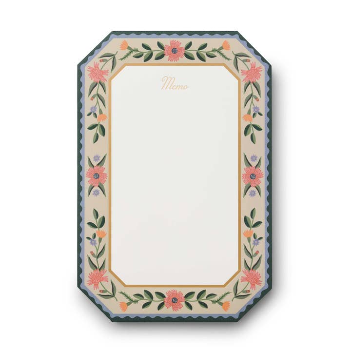 Illustrated flowers and a die-cut octagonal shape decorate this notepad, which features 65 tear-off sheets and gold foil on every page. Dimensions: 6" W × 9" L