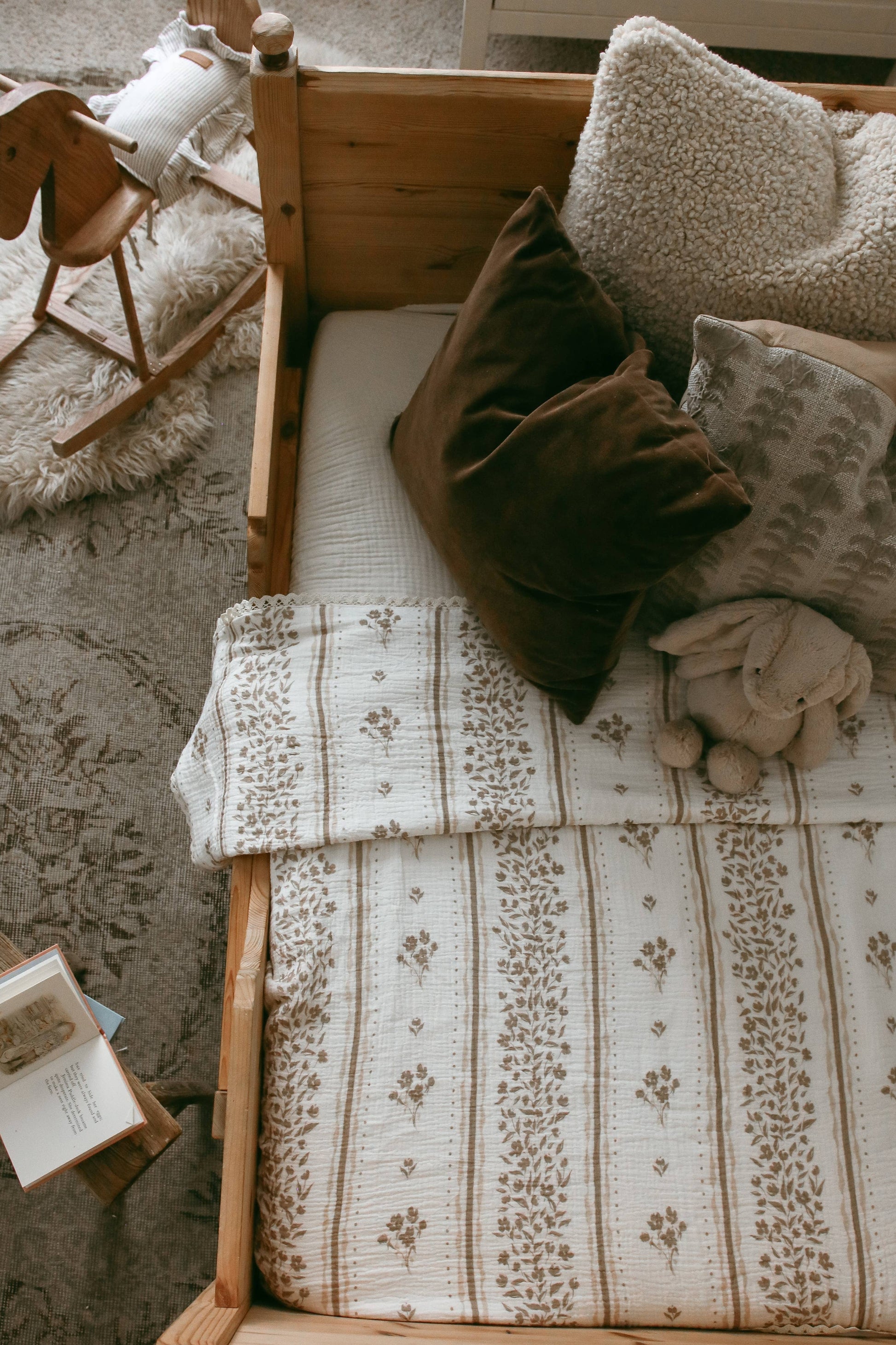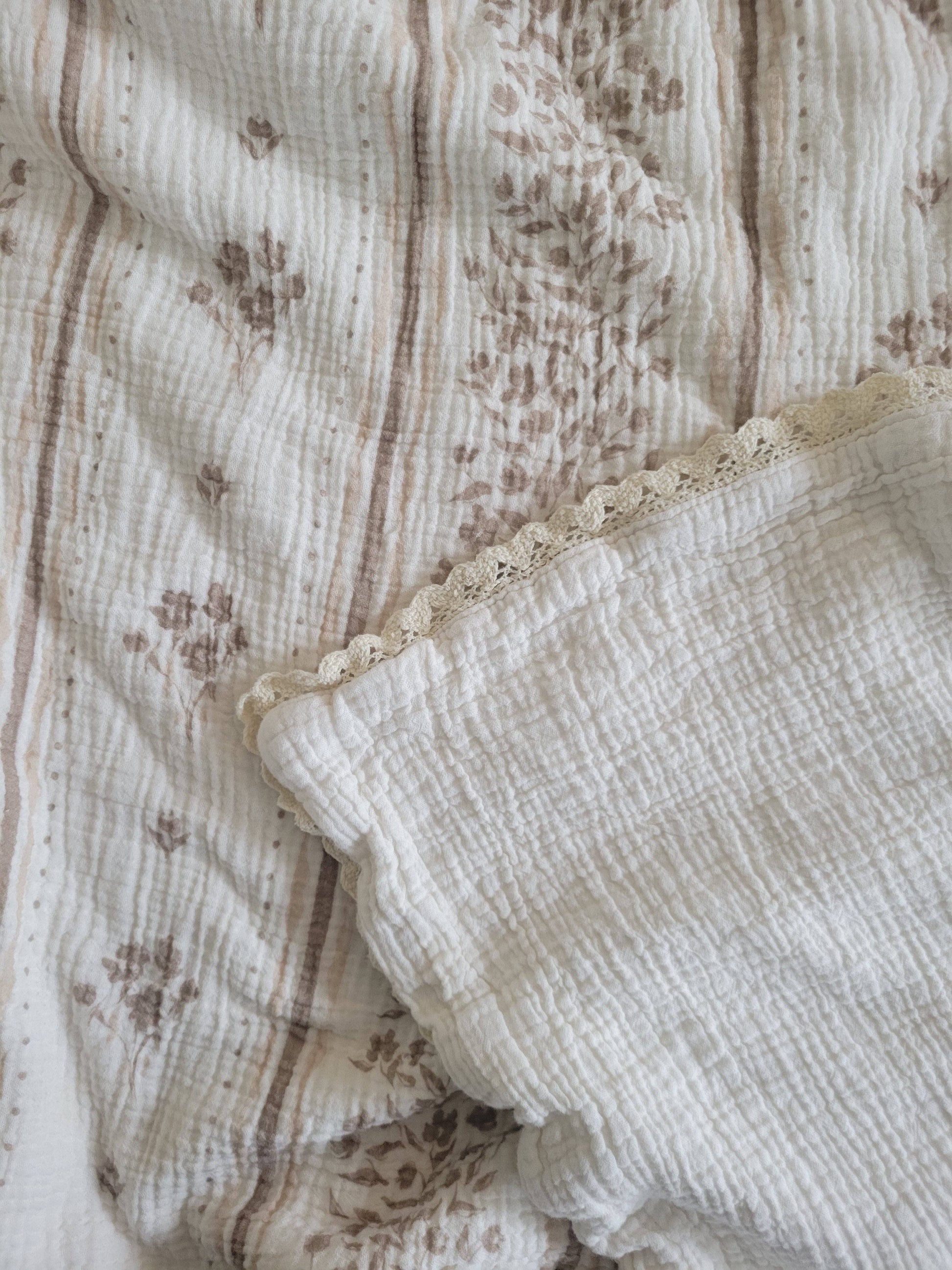 All of your favorite designs, now in a Big Kid Size! The perfect throw for your bigger kids. Features our well-known Ellie + Layne designs on a new 6 layer Crepe Cotton Gauze that is soft, thick and the perfect size. It's a great size for parents, too! SIZE: 50in x 60in before washing. Some shrinking will occur if placed in the dryer. Note: these are not a full twin sized comforter/duvet, but a great addition as a throw, or top layered blanket on a twin sized bed. COLORS: Features a vintage florals in a neutral color palette with a plain white backing. Edging is a cream lace edge or a plain white edge CARE: We recommend spot cleaning as much as possible.