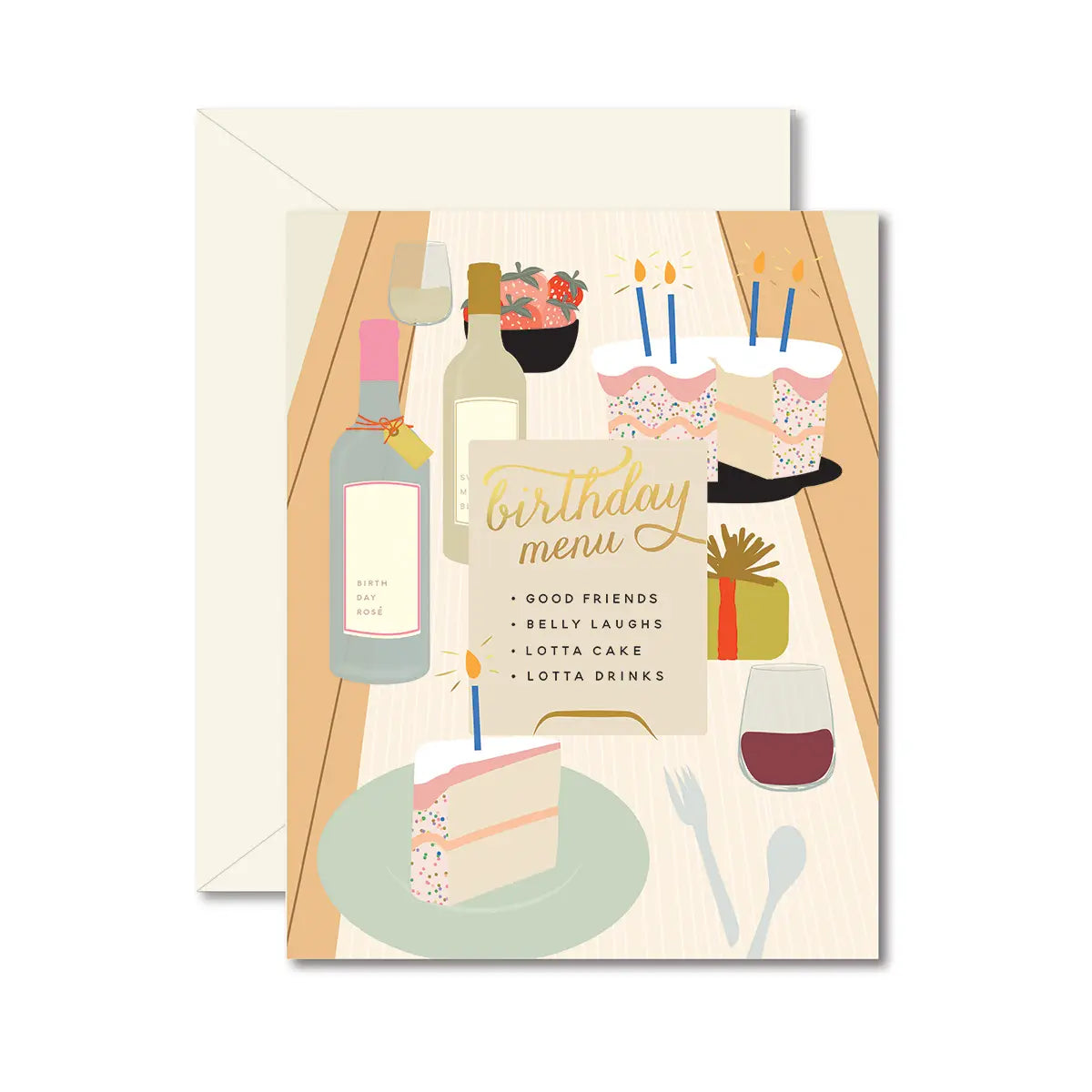 A beautiful birthday table with good friends, belly laughs, lotta cake, and a lotta drinks. Gold foil accents, full-color, 4.25" x 5.5" folded card. With a blank interior, you can personalize your message for the recipient.