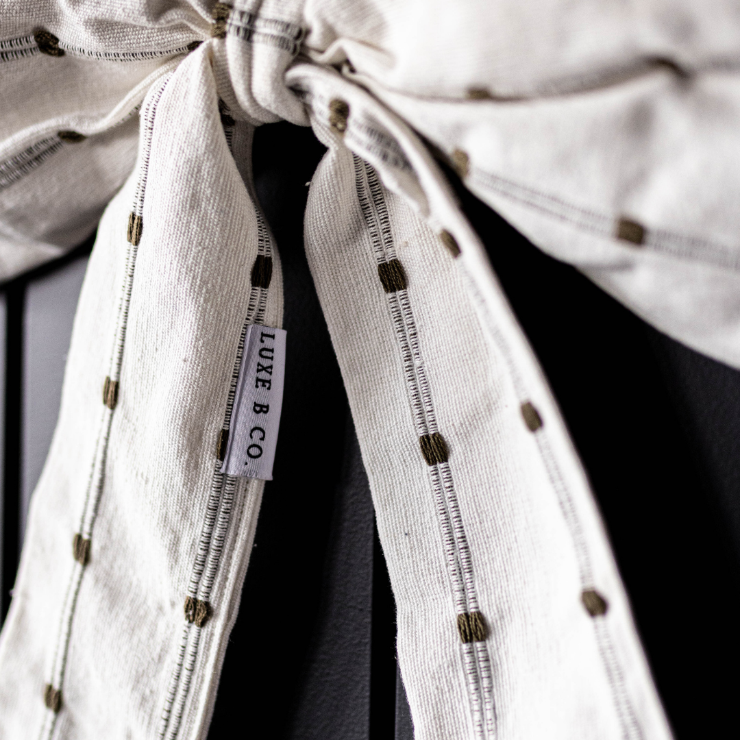 The Luxe B Co. White & Light Green Dotted Stripe Bows are made from soft, premium cotton and hand-finished with a delicate silk ribbon at the center, making them effortless to hang and style throughout your home. Designed with a subtle white & light green dotted stripe pattern, these bows bring a light, airy charm to any space. Their clean, classic look makes them a beautiful addition to both seasonal displays and everyday decor. Perfect for adding a touch of elegance to nurseries, entryways, mantles, or even as wall accents. The White & Light Green Dotted Stripe Bows are ideal for adorning trees, wreaths, or giving your gift wrapping a thoughtfully handcrafted finish.