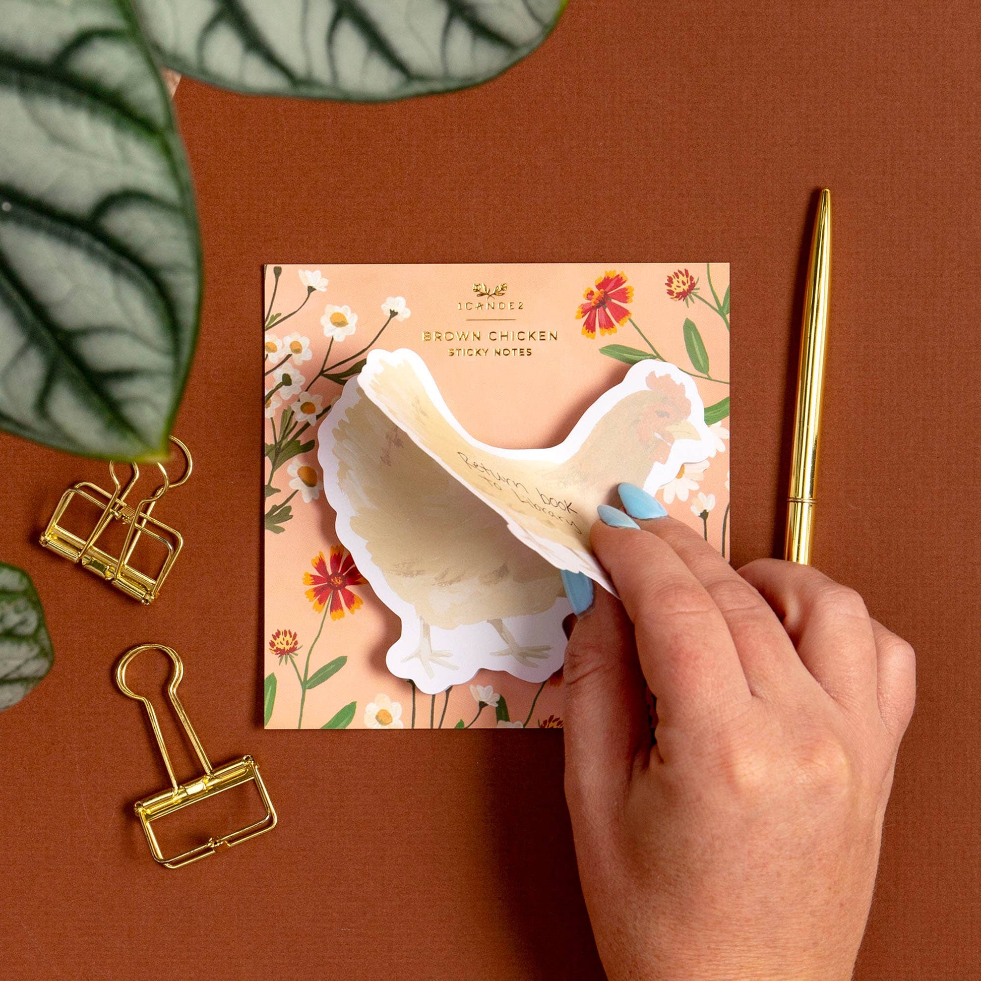 Add a touch of rustic charm to your workspace with our Brown Chicken Sticky Notes. Featuring a die-cut design of a cute brown chicken, these sticky notes are both practical and playful. Perfect for jotting down reminders, to-do lists, or quick thoughts, each set includes 52 sheets to keep you organized. The sturdy chipboard backer ensures these notes hold up to daily use. Ideal for anyone who loves farm life or rustic decor, these sticky notes make a delightful gift for birthdays, housewarmings, or office essentials. Whether you're at home or at work, the charming brown chicken design will bring a bit of farm-inspired fun to your day. Size | 4.75"x4.75"