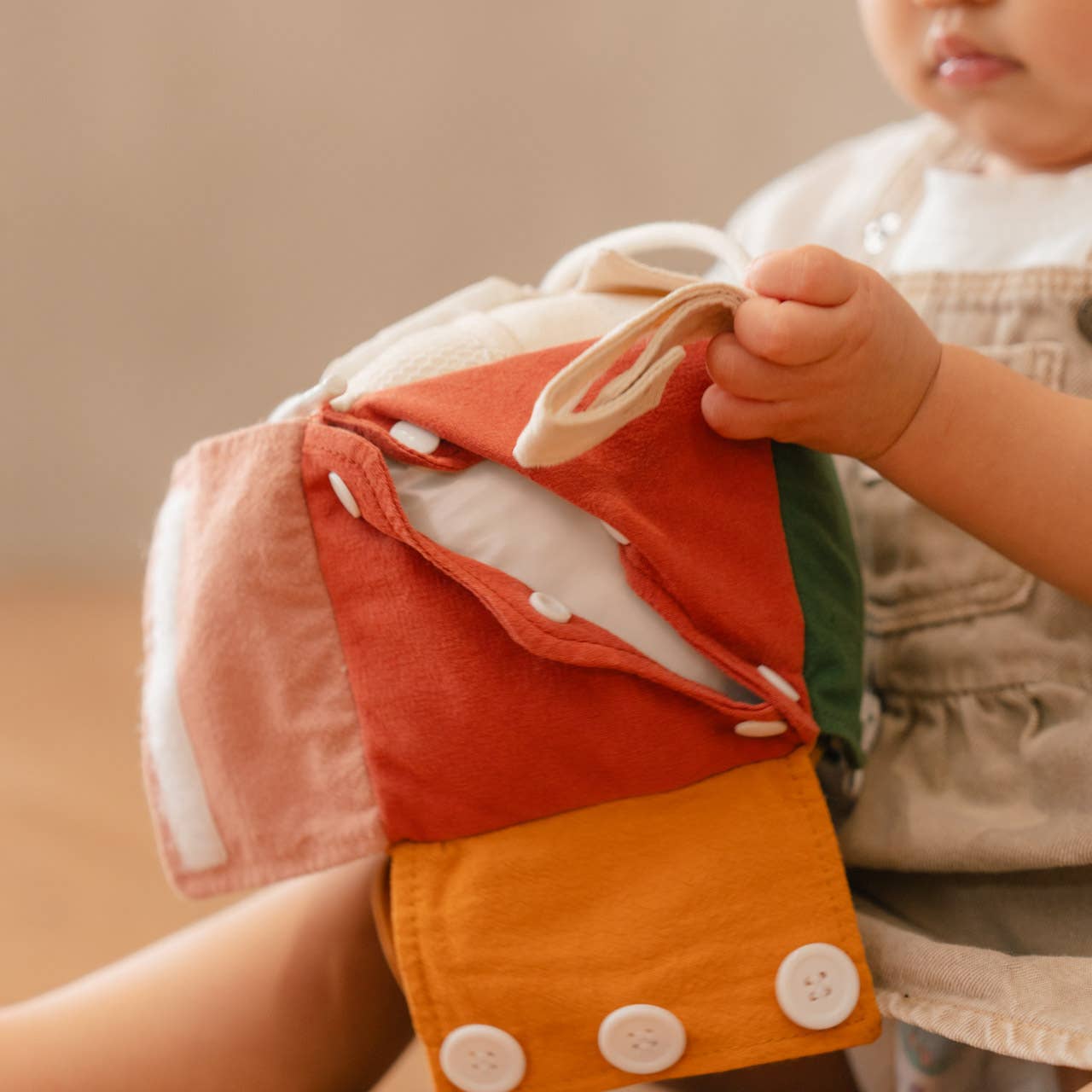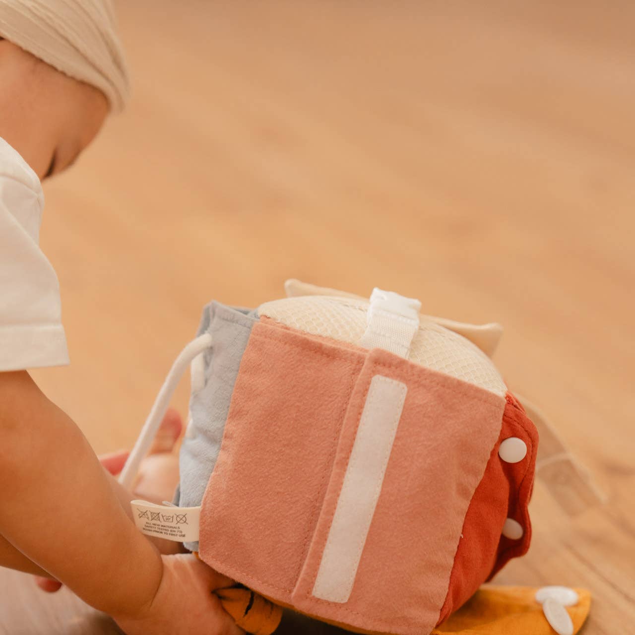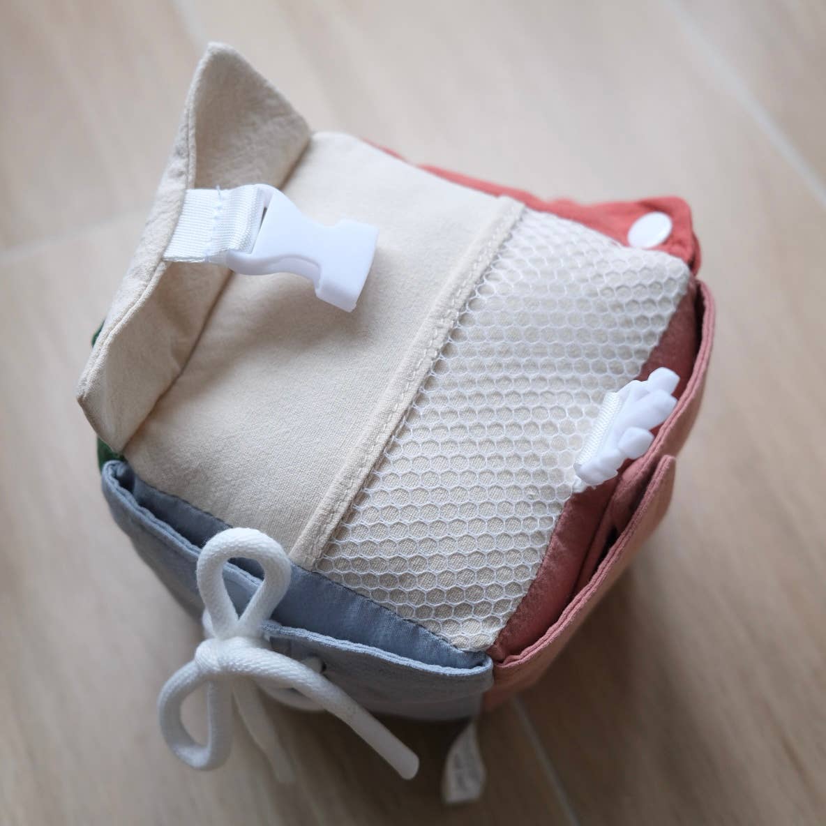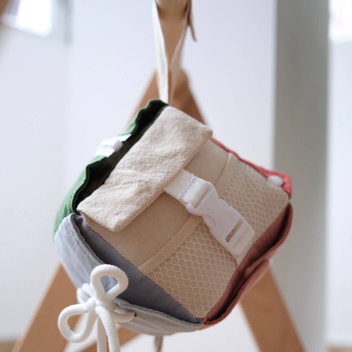Provide our BUSY CUBE to your little one and let them learn 6 different essential ways of dressing themselves. Perfect to teach them to use their fingers and practical life skills! The snap strap allows easy attachment to your one's wrist or strollers and baby gyms! Approximately: 6 x 6"