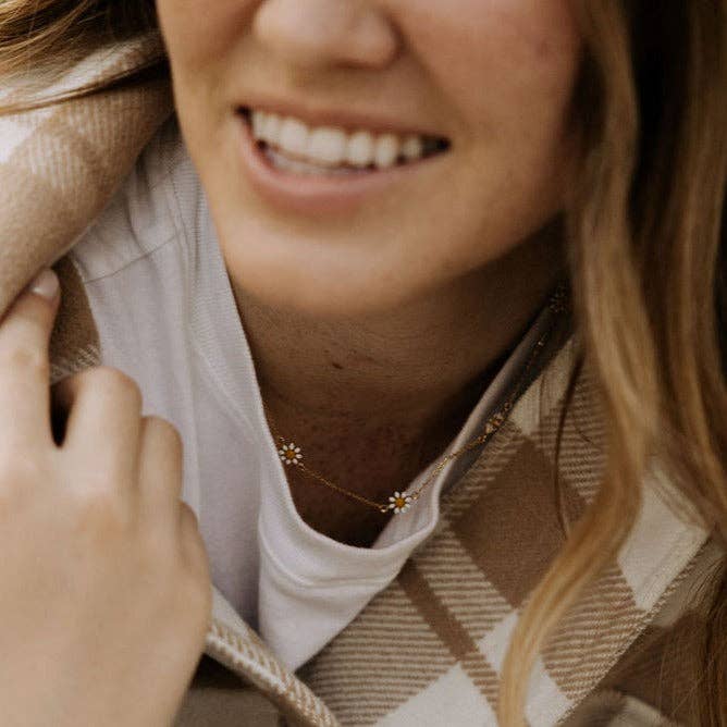 The Carolina Daisy Necklace is a dainty floral chain necklace made of high quality, hypoallergenic gold vermeil (gold plated over sterling silver). Chain measures 14" with an extender up to 16".