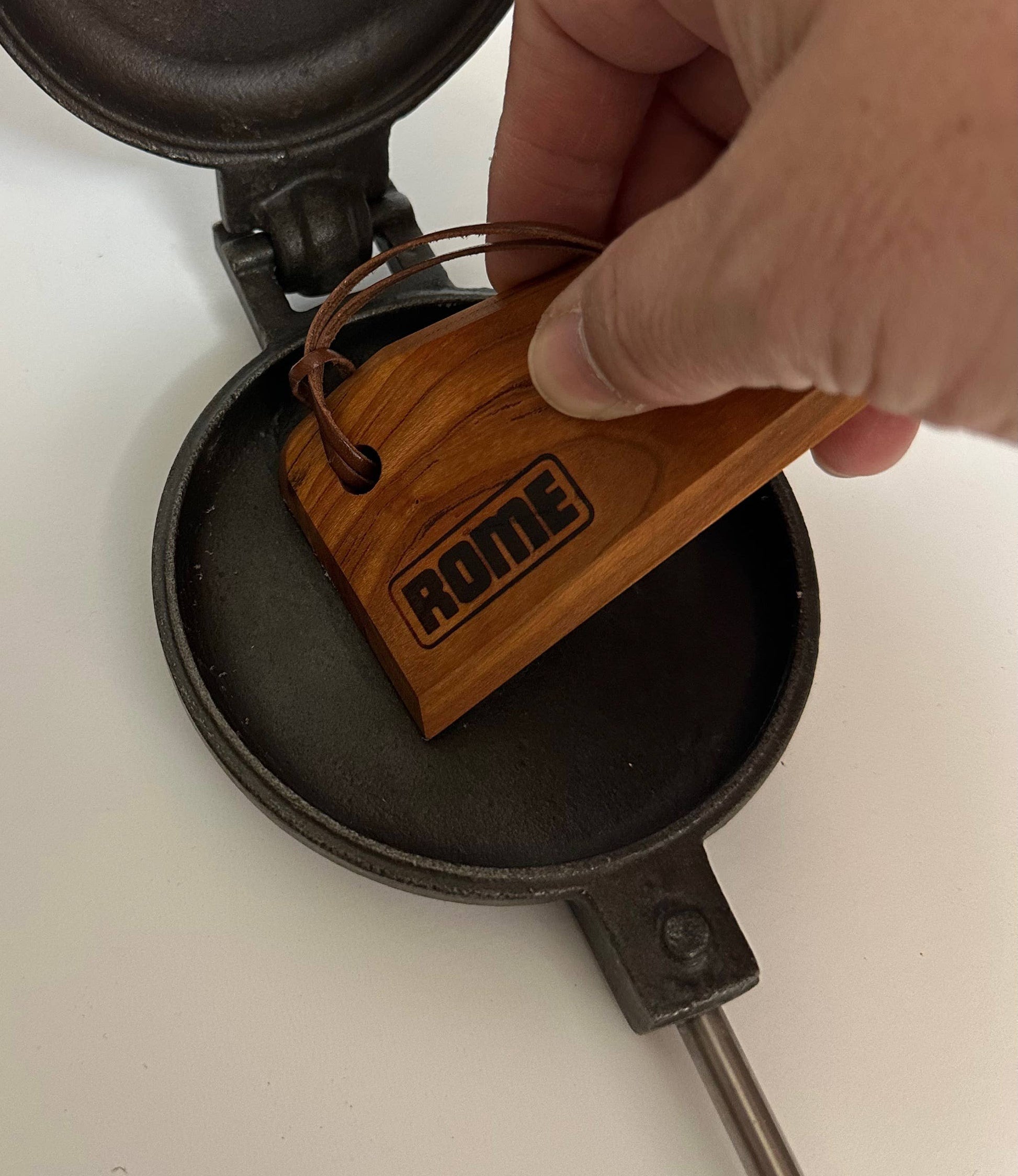 Beautiful, handmade scraper designed for removing and cleaning up cooked on food from your Rome cast iron pie irons as well as regular cast iron skillets and cookware. The wood has a chiseled edge on all sides along with corners that go from soft curves to hard ends to give you various ways to release stuck food from your cast iron. Each piece is made in Pennsylvania by a craftsman using locally forged hardwoods (cherry.) The hardwood is carved with care and finished Materials & dimensions: 3 5/8” x 1 ¾” x 3/8”: Weight 1 oz. Designed by Rome Industries. Part of the Nomadic Grill Collection Creating campfire memories since 1964