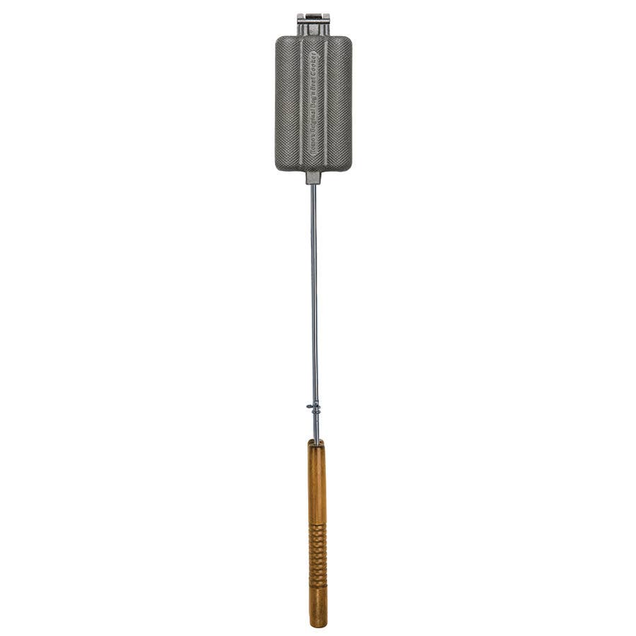 Cook hot dogs & brats (3 at a time) over the fire while sealing in the juices and not piercing the meat with this handy cast iron pie iron style cooking device from Rome. To use, simply open up the clamshell style castings, drop in your dogs, close & latch, and cook over the fire until done. Also works great for cornbread sticks. A great family activity for use over firepits and campfires. 3 5/8" x 6 1/4" cast iron cooking surface with an overall length of 30". Chrome-plated steel rods and wood handles. Complete recipes and instructions included. 10-year warranty. An original design made by Rome, a specialist in around-the-fire fun since 1964.