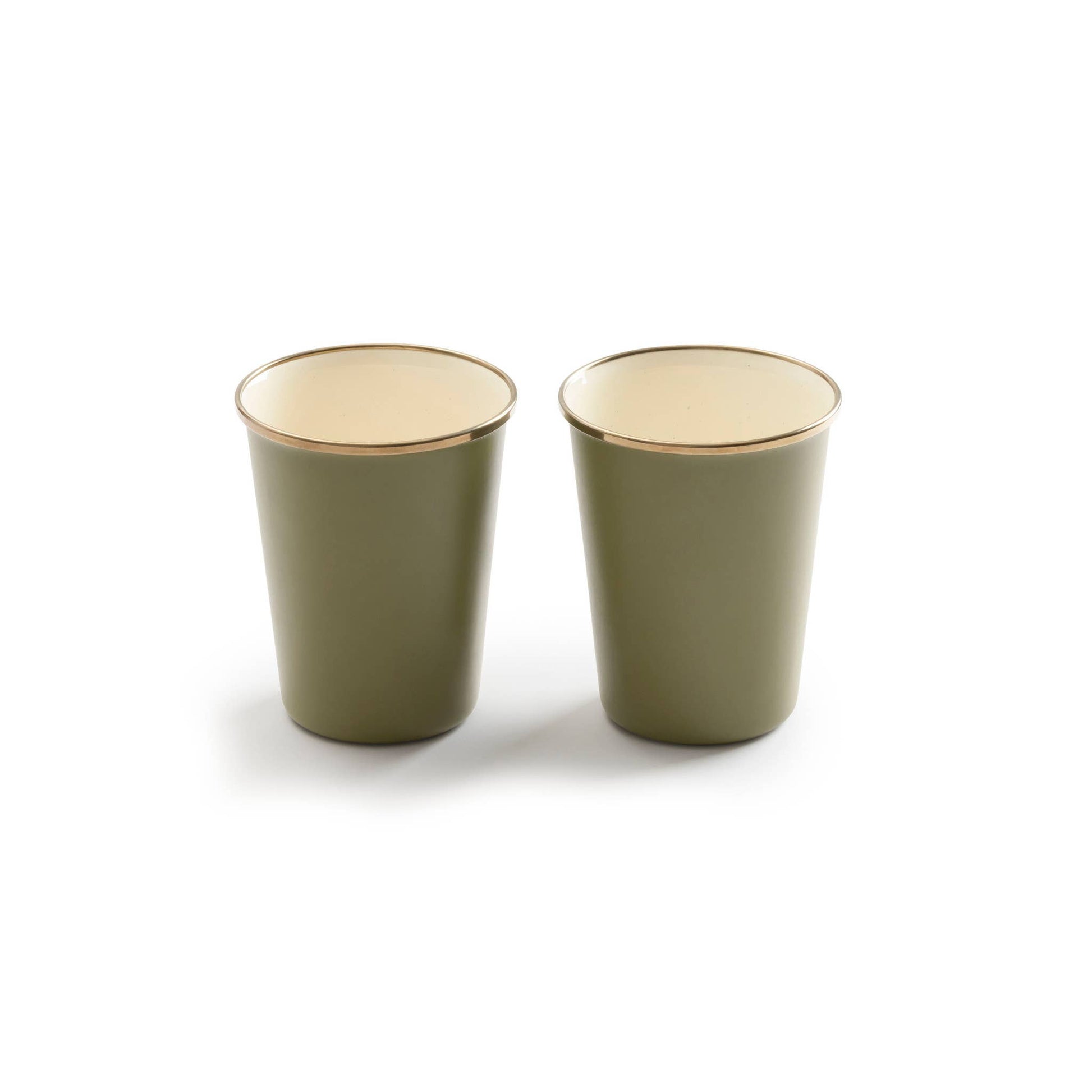 Our two-tone enamelware is crafted with a solid steel core and a rust-resistant heated glass exterior, producing a sturdy and sleek piece. The interior is a smooth and speckled enameled white, while the exterior boasts a sophisticated matte olive drab color, complete with our signature bronze-like stainless steel rim. In addition to retaining the characteristics of traditional enamelware, the smooth interior also guards against food stains, while the textured exterior provides superior grip and resilience. Hand wash only. Do not microwave.