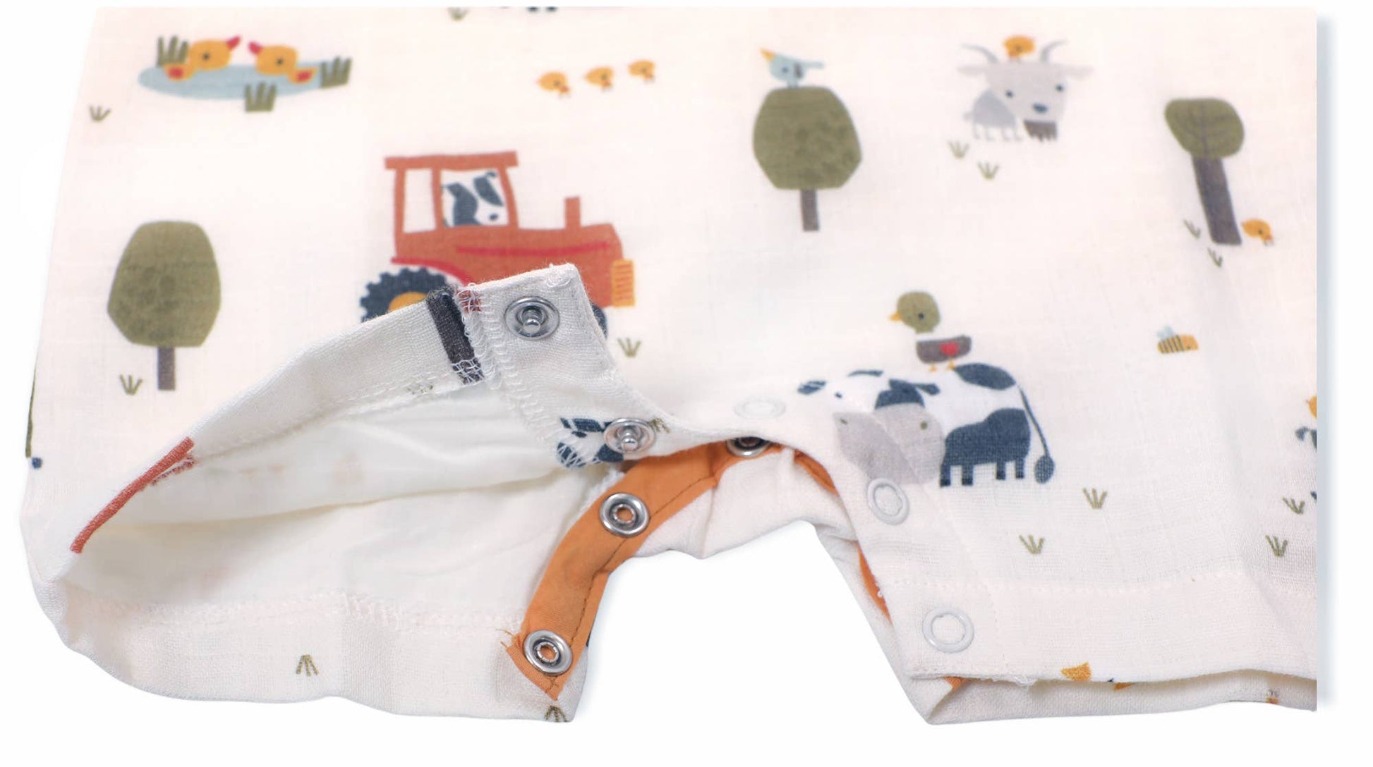 This adorable sleeveless romper features a delightful farm scene with cheerful animals frolicking in the sunshine. Crafted from 100% organic cotton muslin with a soft voile lining, it's wonderfully breathable and perfect for warm weather play. The playful design includes practical snap closures at the crotch for quick diaper changes, plus a handy pocket for little treasures. Digitally printed for extra softness and lined for comfort, this piece is gentle on sensitive skin with zero harmful chemicals. Ethically made in India from sustainably sourced cotton, it's built to last through multiple washes and siblings. Lightweight, cozy, and eco-conscious—the ideal companion for spring and summer adventures.