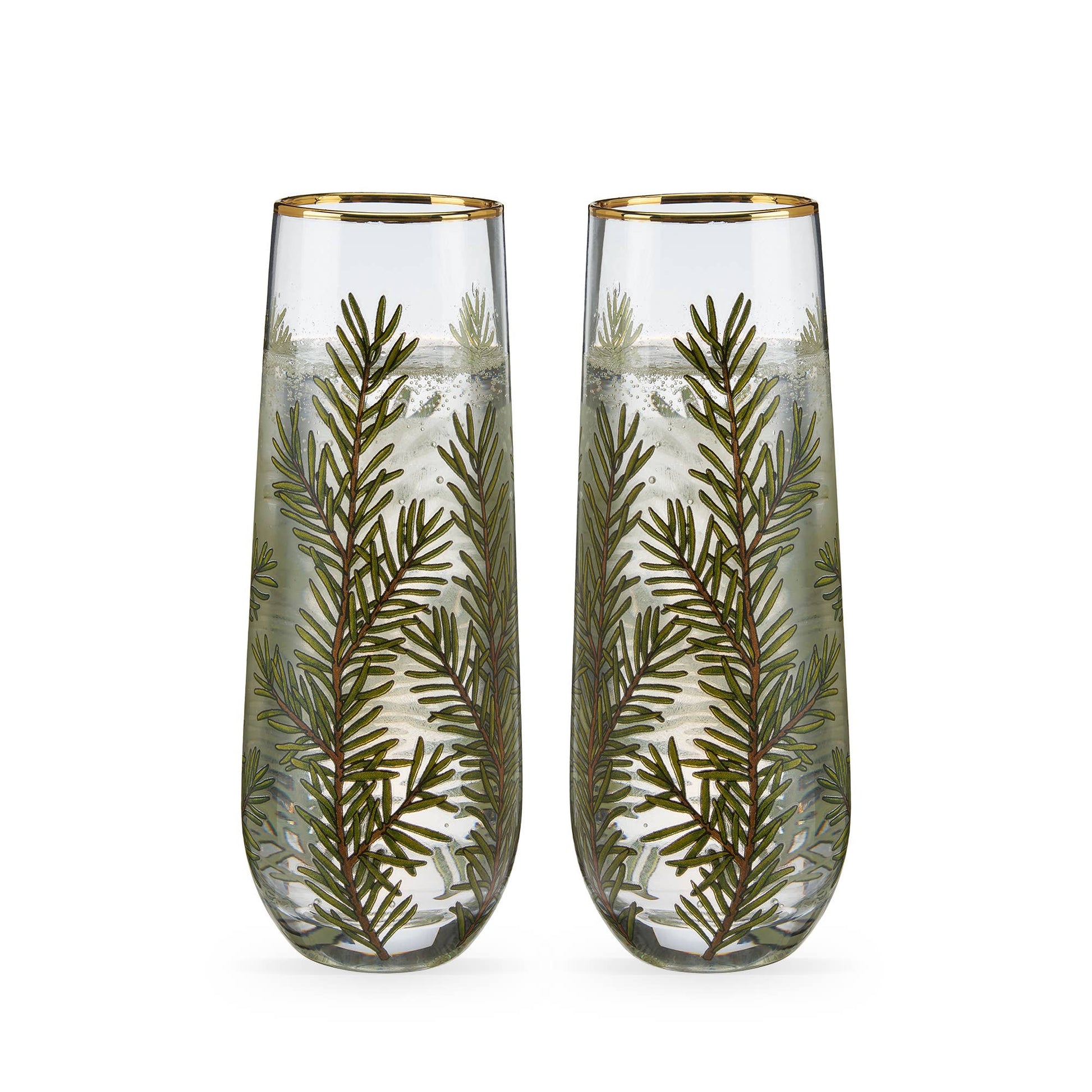 Bring the beautiful flora of winter to your table with this set of woodland champagne glasses. Adorned with evergreen sprigs, these vessels are sure to make a statement all year round. Capacity: Holds 8 ounces comfortably Materials: Glass, Electroplated gold rim Care: Hand wash recommended