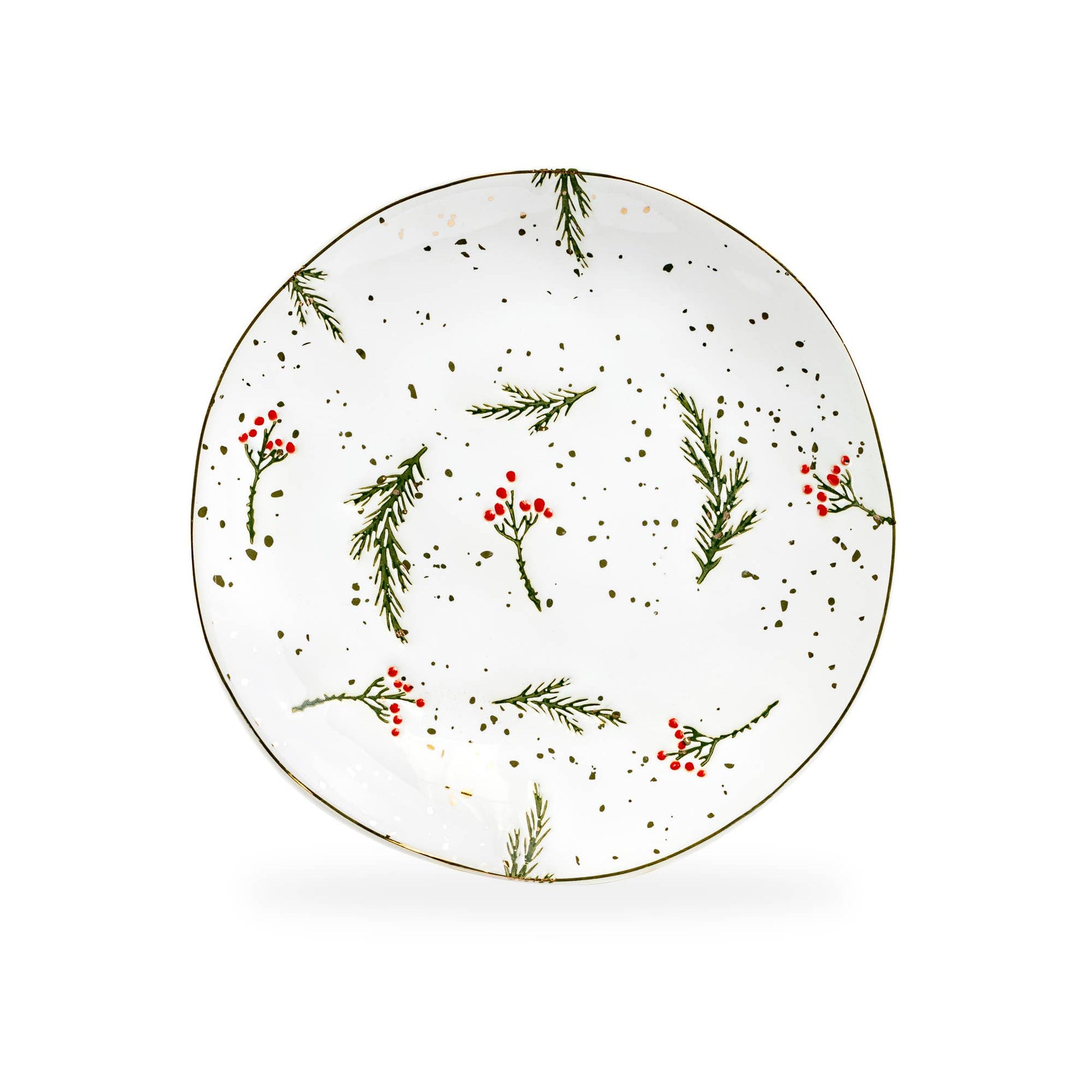 The Holly Berries Organic Shape Dessert Plate showcases charming holly berry and evergreen designs carved for a fun, textured feel. Tiny gold flecks add a gentle shimmer, boosting its festive vibe. With a quirky, handcrafted shape, this 7.5" stoneware plate is perfect for everyday treats or holiday celebrations. Dishwasher safe for easy cleanup, though gentle hand washing is best and microwave use is a no-go because of the gold accents.