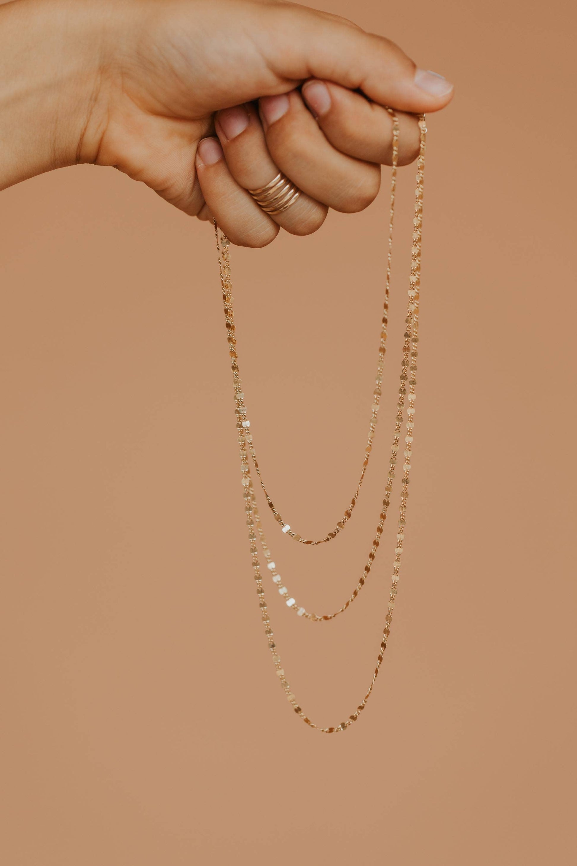 A smaller version of our beloved Confetti Choker. This chain is more low-key, but still provides the same glitter and shine. * 2mm curved long & short chain. 18" long. Comes in 14kt Gold Fill. * Made by hand in Eau Claire, WI. Our jewelry is one-of-a-kind, so each piece may differ slightly from the image.