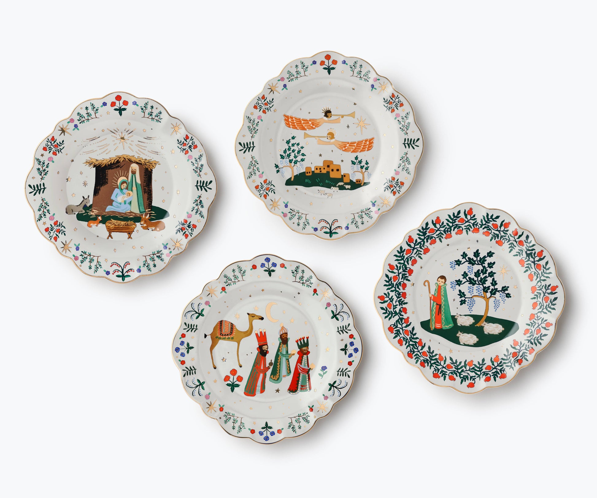 Intricate, nativity-inspired illustrations adorn these porcelain dessert plates, featuring metallic gold accents and gold-painted edges.