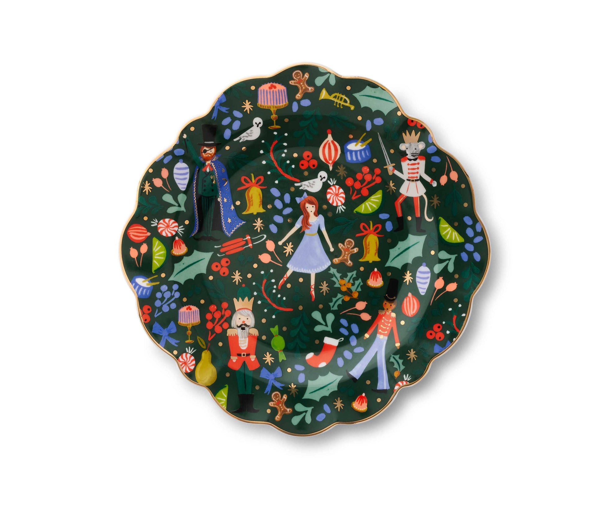 Assorted Set of 4 Nutcracker illustration with metallic gold accents and gold painted scallop edges.