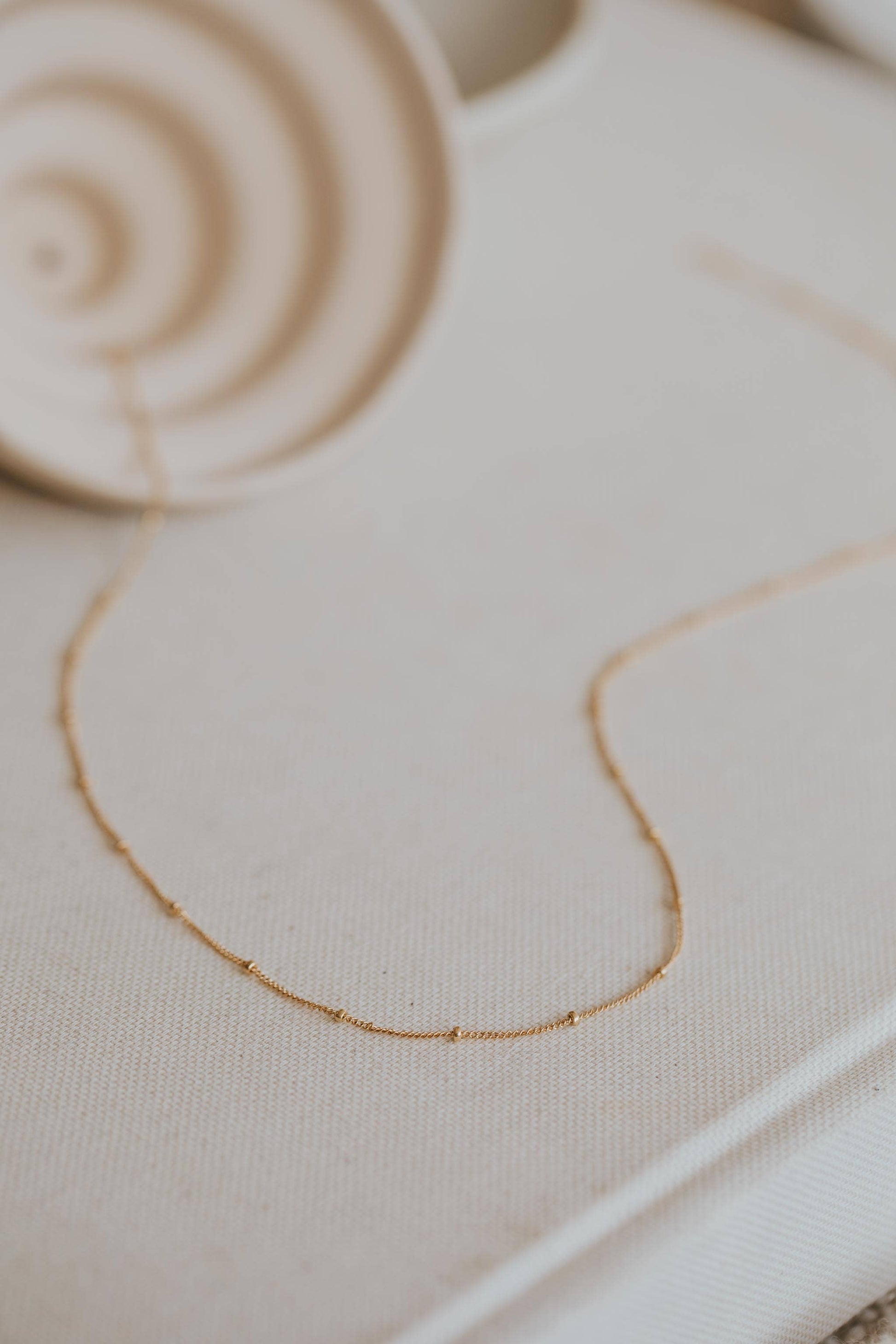 A quaint + delicate layering chain. 20" lengths. In 14kt Gold Fill, handmade in Eau Claire, WI. Our jewelry is individually crafted so each item will be one-of-a-kind and may vary slightly from the photo.