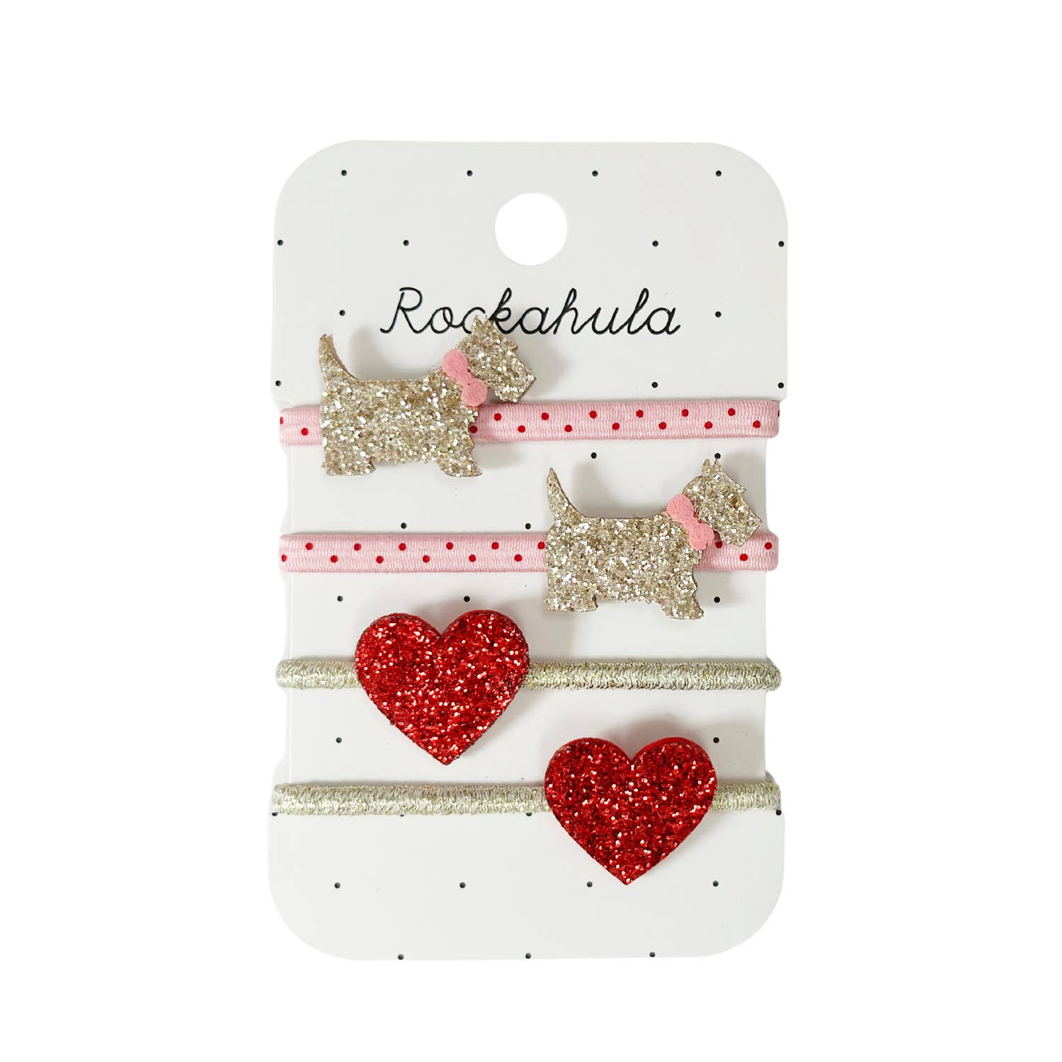 This four pack of ponies feature our sweet and playful Scottie dogs who are the perfect companion for picnic adventures at the park! This pack includes two adorable Scottie dogs on spotty elastics, and two love glittery hearts on gold shimmer elastics. Matching clips also available. Made using recycled felt and glitter. Not suitable for children under 36 months due to small parts.