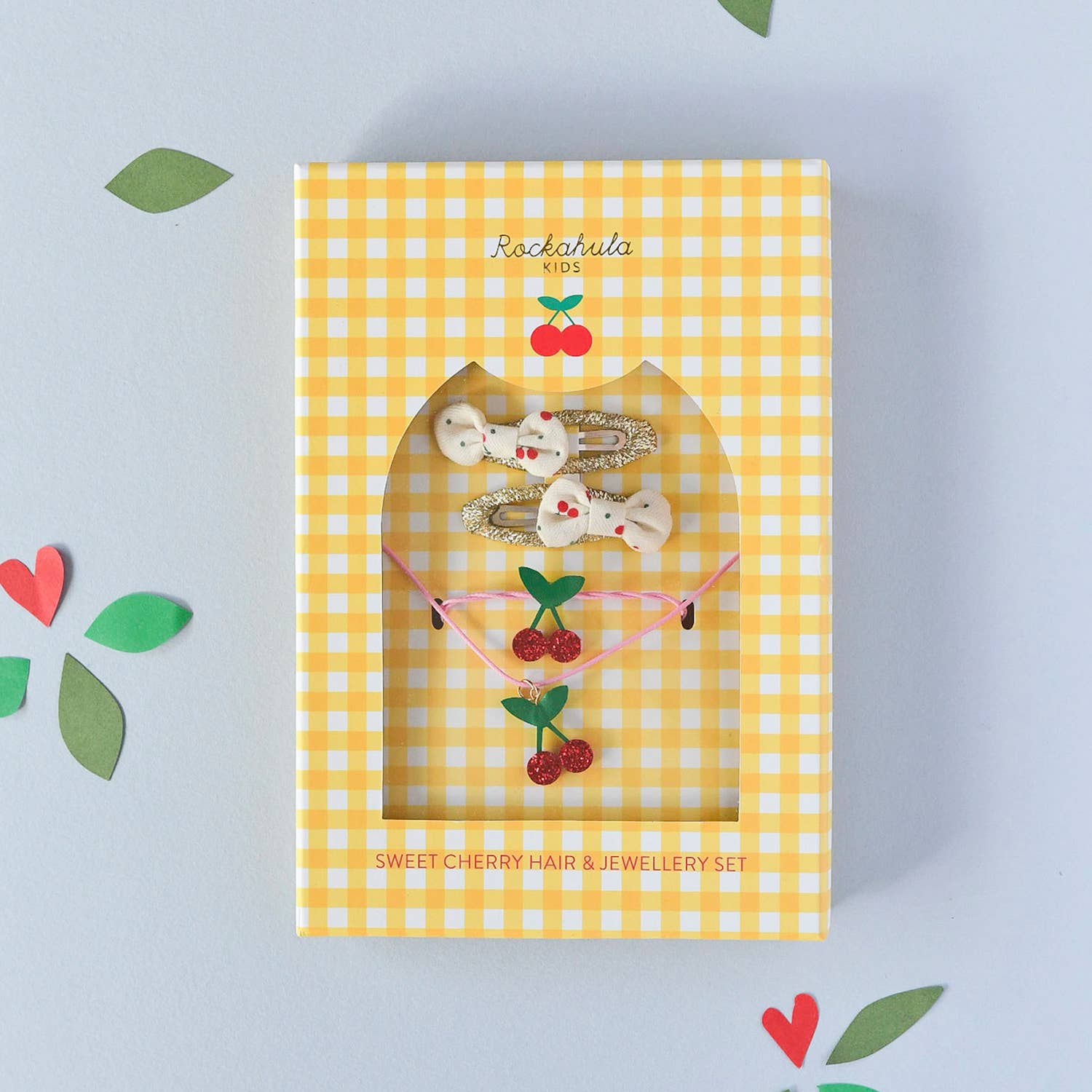 This lovely gift box makes the perfect gift for picnic lovers! The set includes two clips with our cherry fabric bows, a sweet cherry necklace and bracelet. Each set is beautifully presented in our gingham gift box that is the perfect size for letter box gifting! Matching hair clips, ponies and jewellery box also available. Made using recycled felt and PU. Box dimensions: 22cm x 15cm