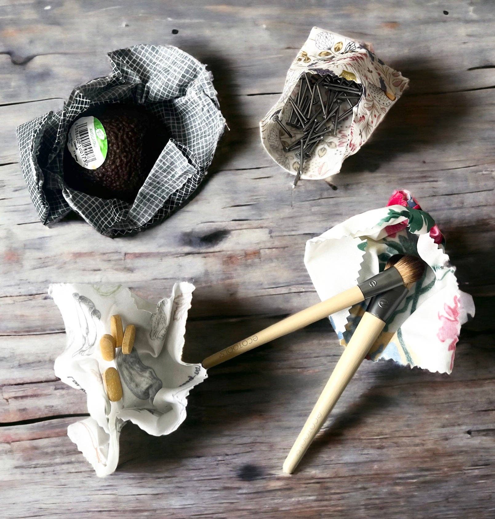 This set includes an assortment of five different extra small wraps in varying sizes, perfect for small produce like the ends of cucumbers or for covering mason jar lids or small containers. Please note that the prints included in your bundle will be based on availability, as our pattern selection varies greatly from day to day.