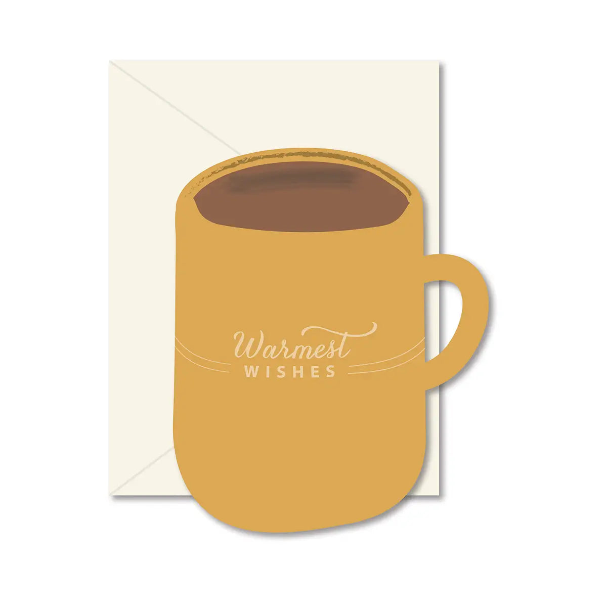 Warmest wishes via the cutest die-cut coffee mug. Full-color, 4.25" x 5.5" folded card. With a blank interior, you can personalize your message for the recipient.