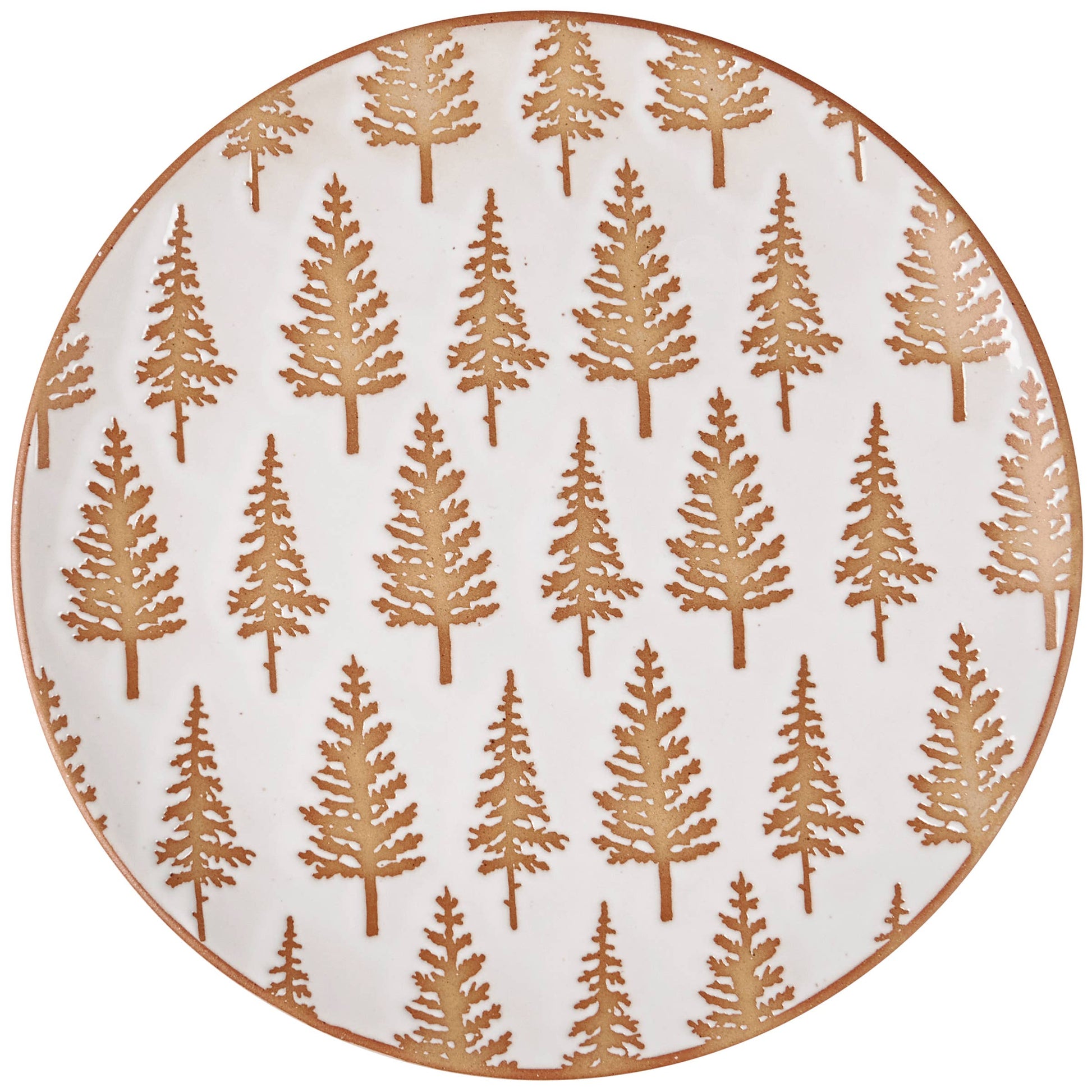 A durable stoneware salad plate from our Christmas Collection displaying a snowy cream color with a debossed brown winter tree pattern. Salad Plate features bare ceramic along the rim. Our Winter salad plate is microwave, dishwasher, and food safe for convenient use. A piece of rustic tableware perfect for seasonal gatherings.